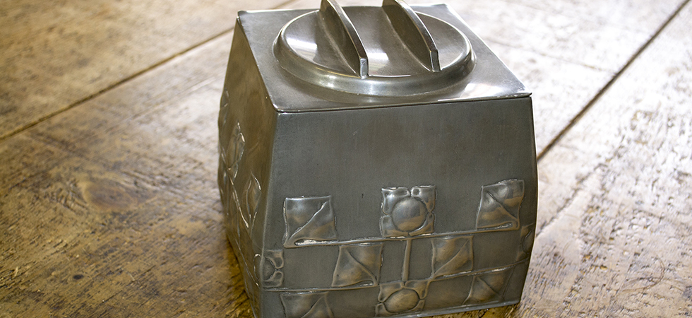 A Liberty Pewter Biscuit Container and Cover, Designed by Archibald Knox, Repousse decorated with stylized flower heads, impressed English Pewter 0194 to base