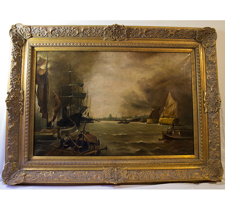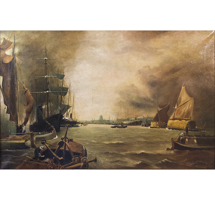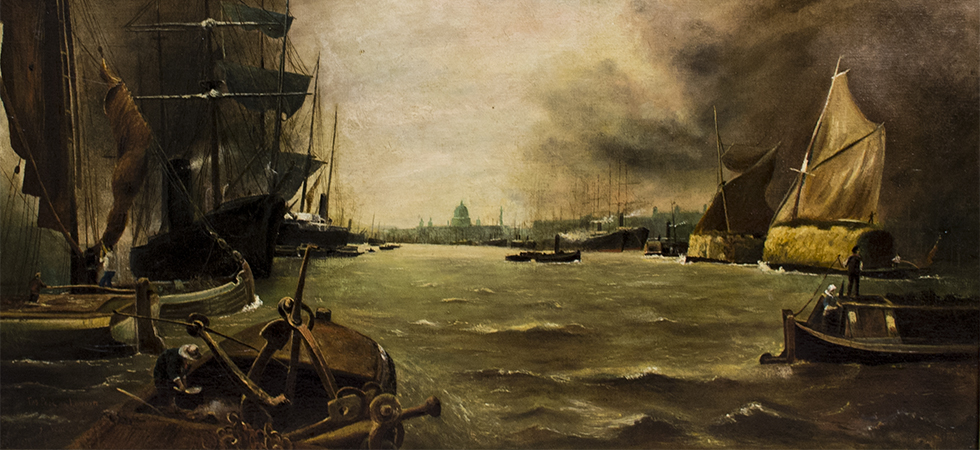This painting titled “The Pool of London” by the British artist George Vicat Cole, depicting the bustling Thames river filled with ships.